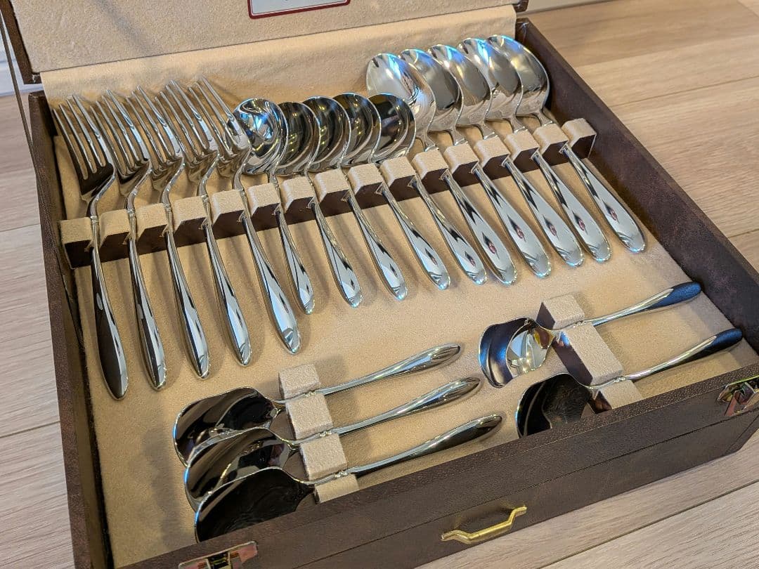 【希少 フルセット】Todai Original Collection STAINLESS 18-8カトラリーセット ディナーセット〈45本セット〉5人分【未使用】未使用ですが家庭での保管期間が長く、個々のビニール袋に多少のシワや破れがあります。空気に触れたと思われる箇所に虹色の変色がありますが、洗剤で洗うと綺麗になることを確認しました。ビニール袋による擦れがあります。◎ナイフがビニール袋を突き破っている場合があります◎◎ケースにはダメージがあります◎【素材】ステンレス 18-8【セット内容】サーブスプーン 1本サーブフォーク 1本バターナイフ 1本シュガースプーン 1本スープサーブスプーン 1本ディナーナイフ 5本ディナーフォーク 5本ディナースプーン 5本スープスプーン 5本ティースプーン 5本ケーキフォーク 5本コーヒースプーン 5本ヒメフォーク 5本合計 45本★カトラリーの名称は参考までにお考えください★◎佐川急便/日本郵便に変更する場合があります◎〜冷暗所にて丁寧に保管していますが、保管に伴う多少の擦れ、汚れはあると思います〜カトラリーセットテーブルセットテーブルコーディネートナイフフォークセット嫁入り道具ステンレスカトラリー。銀食器 フォークセット6本。ビニール袋によるスレはご容赦ください。クリストフル⭐︎銀製カトラリーセット。ラッキーウッド カトラリーセット 5種 25本LUCKY WOOD。ビニール袋がカトラリーにひっついて、跡ができているものもありましたが、洗うととれるようです。Tiffany & Co. 夫婦箸。【未使用 非売品 】ROLEX BUCHERER カトラリースプーンセット。写真をご覧ください。共箱付 1995年製◆マッピン&ウェッブ ケーキフォーク 銀プレート 6本セットレビュー