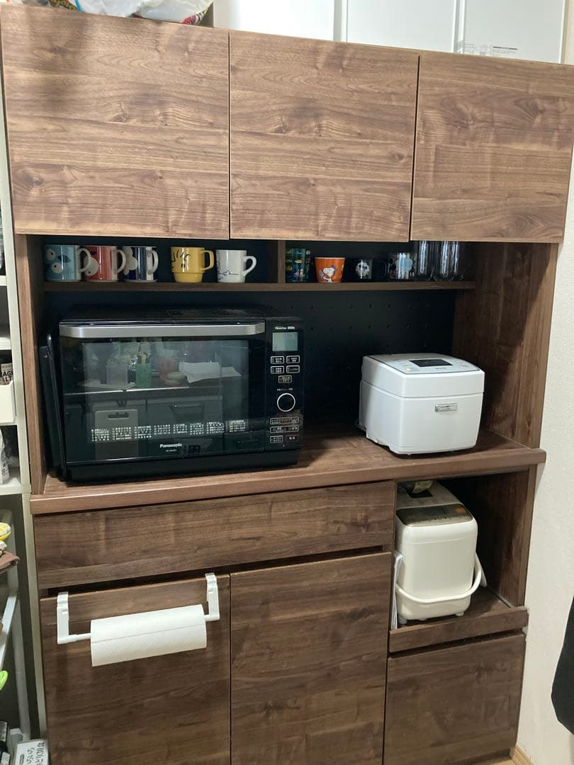 - レンジ台を探していたところ、オシャレさとレビューの良さにこちらに決定。 組立ては女一人で約2時間くらいで完了しましたが、けっこう重量感あり、ガラス戸を付ける時は2人でやった方がいいかと思います。 完成した感想は想像より大きいですが、その分収納力もあり、オシャレさはまちがいなしでした。 見せるところが多いぶん、お掃除もこまめにしてキレイに使えそうです。